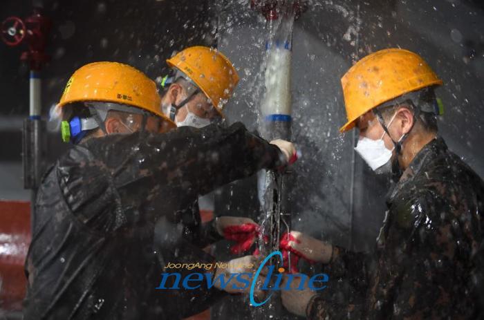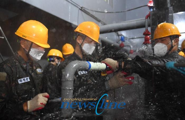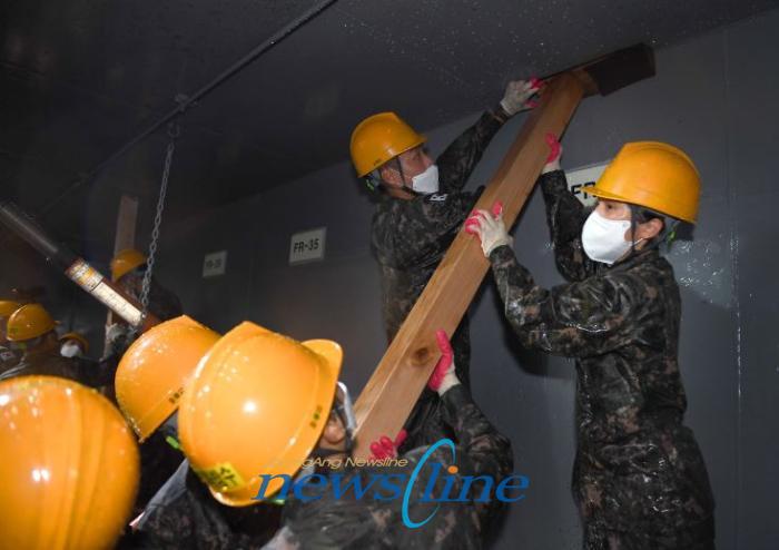 | 제276기 해군 부사관 후보생들이 8월 1일(월), 8전단 소화방수훈련장에서 ‘방수훈련’을 실시하고 있다. |