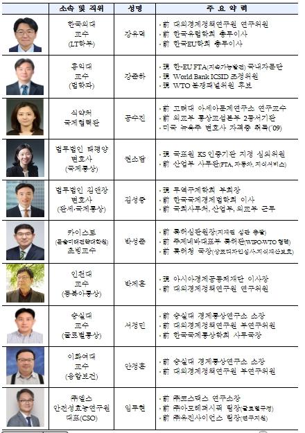 자문단은 10인 내외의 지역별, 분야별 통상·규제 전문가로 구성되어, 정부 및 업계의 상시 자문 요청에 대응하고, 보건의료 통상 분야 관심사에 대해 정기 보고서를 발간하는 등 전문적 통상지원업무를 수행할 예정이다.