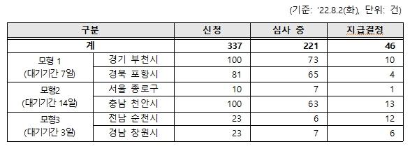 [중앙뉴스라인, 장성대기자] 보건복지부는 아픈 근로자들의 쉼과 소득 보장을 위해 지난 7월 4일부터 상병수당 시범사업을 시행 중으로, 사업 시행 한 달이 지난 8월 2일 현재 신청 건수는 337건이며, 이 중 심사가 완료되어 지급 결정된 46건에 대해 8월부터 수당 지급을 시작한다고 밝혔다.
