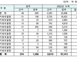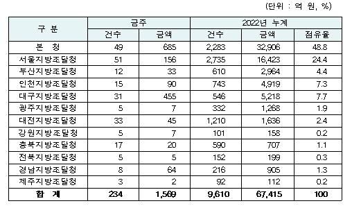 지역별 발주량을 보면 대전광역시 소재 본청 685억 원, 서울지방청 156억 원 등 2개청(841억 원)이 전체 금액(1,569억 원)의 53.6%를 차지하고 있으며, 인천 등 나머지 10개 지방청 728억 원이 각각 집행될 예정이다.