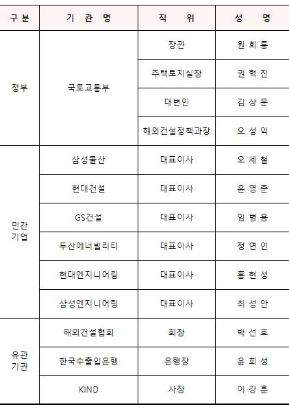간담회에 참석한 국토교통부와 유관기관장들은 각 기관이 추진 중인 해외건설 수주 지원방안을 소개할 계획으로,먼저, 국토교통부는 민간·공기업·정부가 참여하는 팀코리아 진출 확대, G2G 협력 강화, 고위급 수주 외교지원 등 올해 해외건설의 주요 정책 방향을 공유할 계획이다.