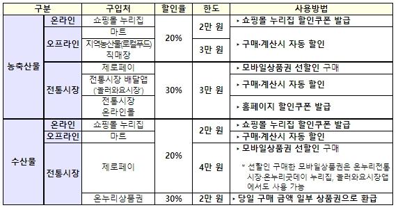 이번 행사는 이마트, 홈플러스, 롯데마트, 지에스(GS) 리테일, 농협 하나로마트 등을 포함한 13개 오프라인 업체와 에스에스지닷컴(SSG.com), 쿠팡, 11번가 등 24개 온라인 쇼핑몰, 그리고 포항시산림조합, 군산로컬푸드직매장 등 25개 지역농산물(로컬푸드) 직매장이 참여한다. 1인당 2만 원(로컬푸드 직매장은 3만 원) 한도로 20% 할인을 지원하며, 참여 업체의 자체 할인을 추가해 소비자들은 최대 50%까지 할인된 가격에 농축수산물을 구매할 수 있다.