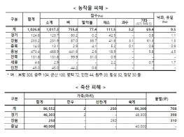 농식품부는 이번 호우로 농작물 1,027ha, 가축 폐사 86,552마리, 꿀벌 708군, 비닐하우스 0.1ha, 농경지 유실·매몰 10.3ha 피해가 집계(8.12. 14시 기준)되었다고 밝혔다.