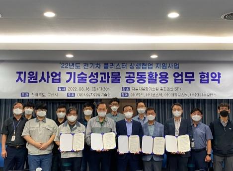 16일 전북도·군산시는 명신 등 군산형 일자리 참여기업 4개사와 ‘전기차 클러스터 상생협업 지원사업’으로 도출되는 기술성과의 공동활용을 주골자로 하는 협약식을 가졌다.