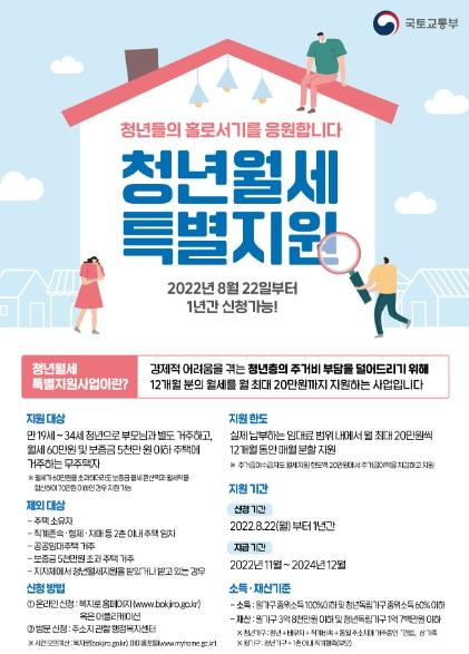 [중앙뉴스라인, 장성대기자] 국토교통부는 지난 7월 20일 발표한 주거분야 민생안정대책의 후속조치로 월 최대 20만원씩 12개월 분의 월세를 지원받을 수 있는"청년월세 특별지원" 신청을 8월 22일부터 시작한다고 밝혔다.