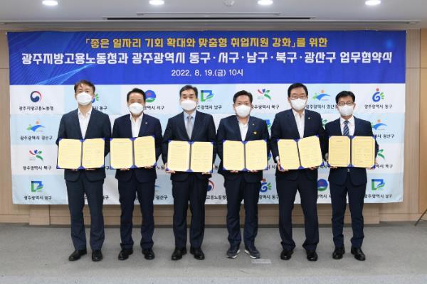 [중앙뉴스라인, 김안나기자] 광주고용노동청과 광주광역시 동구, 서구, 남구, 북구, 광산구 6개 광주지역 공공 고용서비스기관들은 2022.8.19. 10:00, 광주고용복지플러스센터에서‘일자리 문제 해결을 위한 업무협약’을 체결했다.