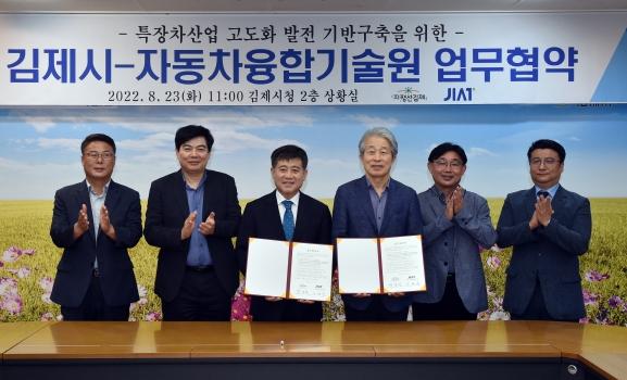이번 협약은 올해 3월 산업통상자원부가 공모한‘자동차 산업기술 개발사업 신규 사업 공모’에 김제시‘특장차 안전·신뢰성 향상 및 기술융합 기반구축 사업’이 선정되어 추진되었으며 협약식에는 정성주 김제시장과 이성수 자동차융합기술원장이 참석하여 협약서에 서명했다.