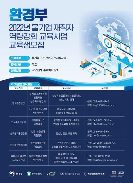 이번 교육은 한국환경공단, 한국수자원공사, 한국물기술인증원, 한국물산업협의회, 유네스코 물안보국제교육센터 등 5개 기관이 8월 24일부터 기관별로 각각 모집하여 시행한다.