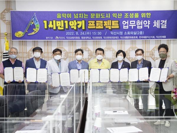 이를 위해 시는 24일 정헌율 시장과 이수경 교육지원청 교육장, 박은숙 원광대 대외협력부총장 등 지역 기관·단체 관계자 등이 참석한 가운데‘1시민 1악기’프로젝트 추진을 위한 협약을 체결했다.참여하는 문화·예술 단체는 익산문화관광재단, 익산문화원, 익산생활문화동호회, 한국예총익산지회, 익산민예총 등이다.