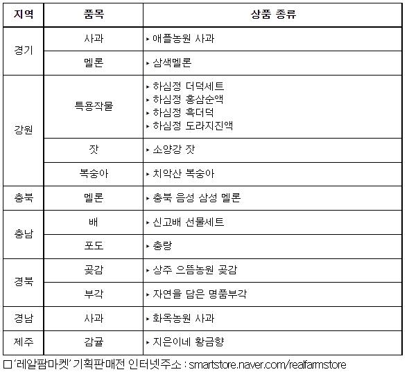 농촌진흥청은 추석 명절을 앞두고 ㈜네오게임즈와 협력해 8월 26일부터 9월 4일까지 온라인 상점(쇼핑몰) ‘레알팜마켓’에서 추석 선물 기획 판매전을 연다고 밝혔다.