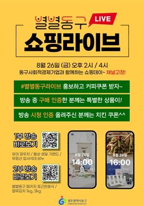 ‘별별동구 라이브커머스’는 네이버 쇼핑라이브 채널을 통해 오는 26일 오후 2시, 4시 두 차례에 걸쳐 진행되고, 네이버 쇼핑라이브에서 ‘별별동구’를 검색 후 시청할 수 있다.