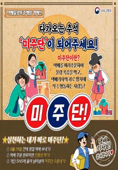 (사전 주문 독려) 국토교통부는 택배가 특정 시기에 몰리는 것을 막기 위해 명절 성수품 주문이 많은 지자체·공공기관 등에 ‘사전 주문’을 독려하는 등 물량을 분산시키고, 택배 이용이 많은 젊은 층의 주문을 분산하기 위해 ‘미주단 캠페인’도 진행 중이다.