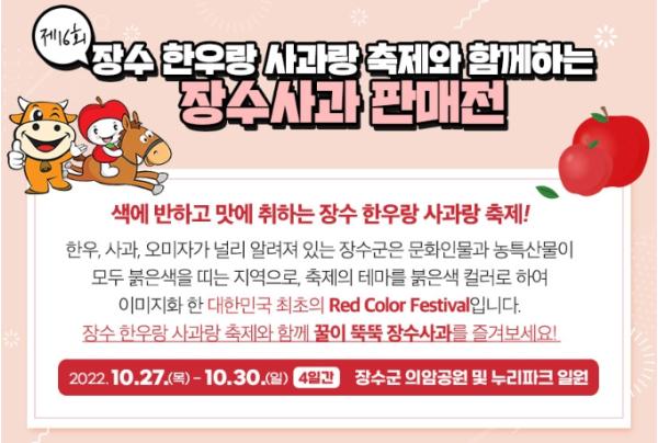 이번 판매전은 장수군과 장수군조합공동사업법인, 장수농협, 장계농협, 장수사과원협, 신농영농법인이 협력해 통합 마케팅을 추진해 명품 장수사과를 홍보하기 위한 것으로 군은 이번 행사를 통해 소비자들에게 저렴한 가격으로 장수사과를 판매할 예정이다.