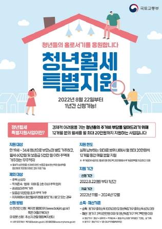 지원 대상은 만19~34세 청년으로 부모와 별도 거주하고 월세 60만원 및 보증금 5,000만원 이하 주택에 거주하는 무주택 청년으로 월 최대 20만원까지 12개월 동안 월세를 지원한다.