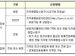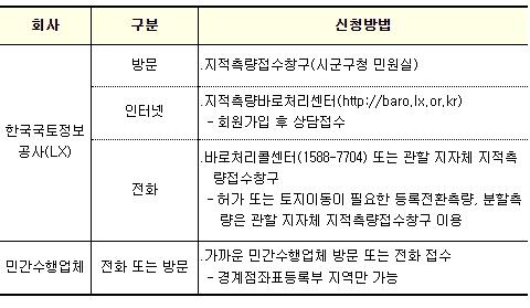 지적측량을 신청하려는 피해 주민은 토지가 소재한 시·군·구청 민원실에 마련된 지적측량접수창구를 방문하거나 인터넷(지적측량바로처리센터), 및 전화(바로처리콜센터)를 이용하여 직접 방문 없이도 신청을 할 수 있다.