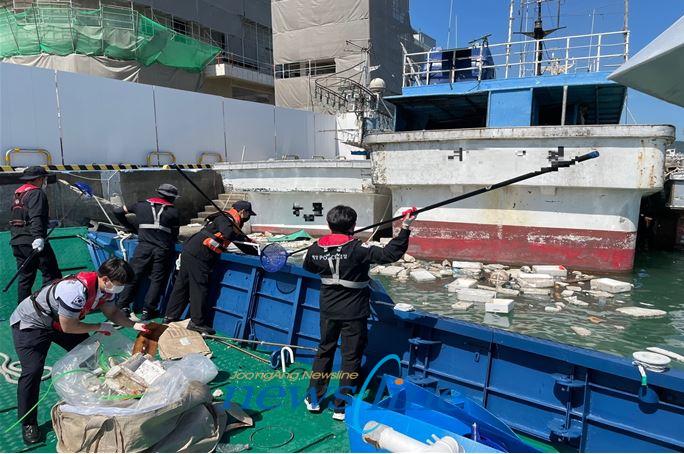 [중앙뉴스라인=송상교기자] 목포해양경찰서(서장 이종욱)가 8일 오전 목포시 북항 인근 해상에서 태풍으로 떠밀려온 해상쓰레기를 수거하며 해양 정화활동을 이어나가고 있다.