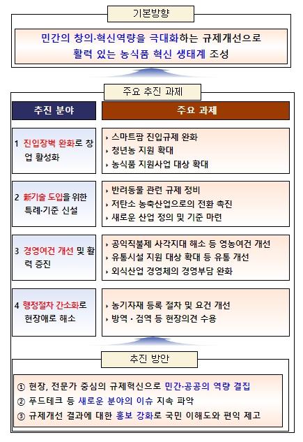 농식품 분야 규제개혁 과제 발굴?개선을 통해 ① 인력유입 등을 위한 진입장벽을 낮춰 농식품 산업의 성장동력 강화, ② 신기술 도입을 위한 특례·기준 신설, ③ 경영여건 개선 및 활력 증진, ④ 행정 절차 간소화로 현장 애로 해소를 지속 추진해 나갈 계획이다.
