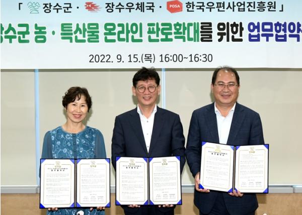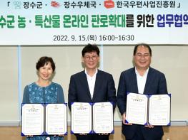 [중앙뉴스라인, 정영철기자] 장수군이 지난 15일 장수우체국, 한국우편사업진흥원과 지역 농·특산물 온라인 판로확대를 위한 업무협약(MOU)을 체결했다.