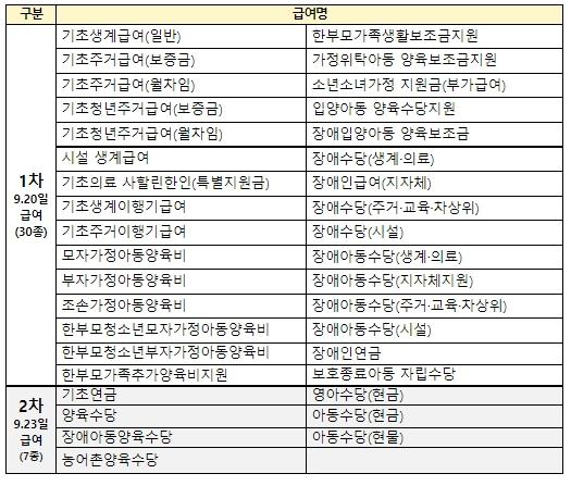 2차 정기급여는 9월 23일에 기초연금, 양육수당, 아동수당 등 7종이 지급된다.