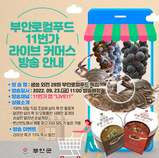 오는 23일 오전 11시부터 모바일앱 11번가 LIVE11 “생쑈 외전 28화 부안로컬푸드 특집” 채널에서 한시간동안 방송되는 이번 라이브커머스에서는 100% 당일 직접 조업해 살이 꽉 찬 활꽃게, 달큰한 살이 꽉 차 오동통한 서해안 꽃게의 순살만 발라낸 순살게장, 변산반도에서 해풍맞고 자라 당도가 높은 거봉까지 총 3가지 상품이 15% 할인된 가격으로 판매된다.