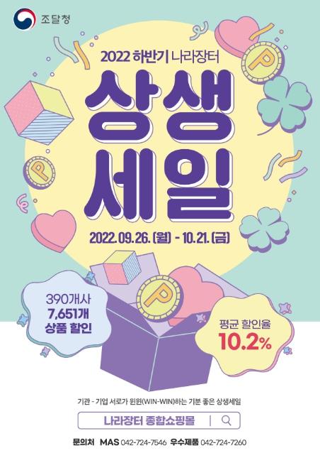 조달청은 조달기업의 판로를 지원하고, 수요기관에게도 알뜰구매 기회를 제공하기 위한 나라장터 종합쇼핑몰 할인판매 행사인'2022년 하반기 나라장터 상생세일'을 오는 9월 26일부터 10월 21일까지 개최한다.