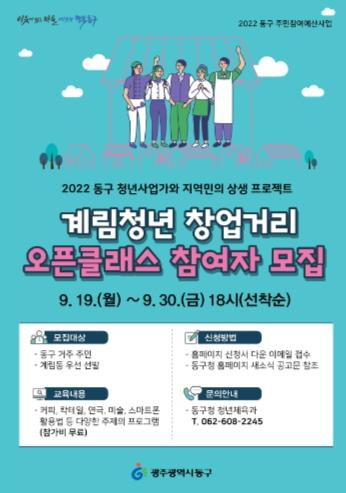 [중앙뉴스라인, 송상교기자] 광주광역시 동구는 청년 사업가와 지역민의 상생 프로젝트 ‘계림 청년창업거리 오픈클래스’ 프로그램 참여자를 오는 30일까지 선착순으로 모집한다고 밝혔다.