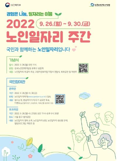 ?2022 노인일자리 주간? 행사 첫날인 9월 26일 11시에는 “경험은 나눔, 일자리는 이음”을 주제로 간소화된 기념식이 ‘더플라자호텔’(서울시 중구 소재)에서 개최되며, 기념식은 한국노인인력개발원 유튜브 채널로 생중계된다.