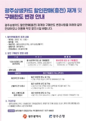 [중앙뉴스라인, 김용범기자] 광주광역시는 지난 6월 재정소진으로 일시 중단된 광주상생카드 할인발행을 10월1일부터 재개한다.