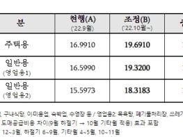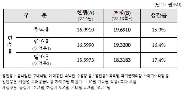이번 요금 인상에 따라, 주택용 요금은 현행 메가줄(MJ) 당 16.99원에서 2.7원 인상된 19.69원으로, 일반용(영업용1) 요금은 19.32원으로 조정된다.
