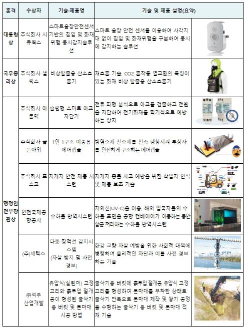 행정안전부장관상에는 산업현장과 국민의 일상생활에 활용되는 6개의 다양한 우수 안전기술·제품이 아래와 같이 선정됐다.