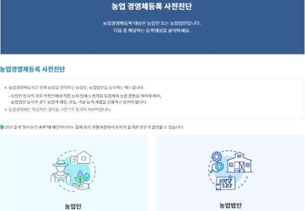농업경영체 등록을 하려는 농업인과 농업법인은 사전에 자가진단서비스를 통해 등록요건을 간편하게 확인해 볼 수 있다.