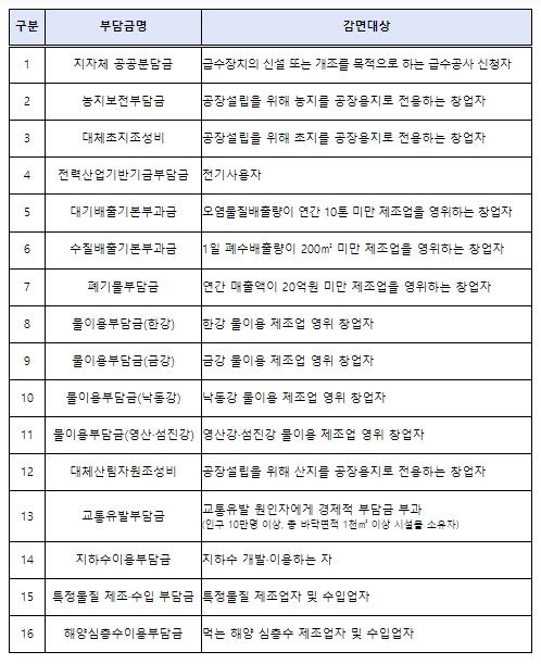 제조 창업기업 부담금 면제 제도는 제조업 창업기업에 대해 창업 후 7년간 농지보전부담금, 전력산업기반부담금 등 16개 부담금을 면제해주는 것이다.