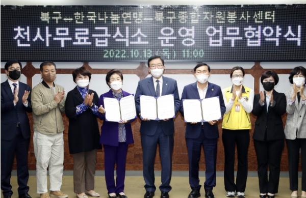 13일 북구에 따르면 (사)한국나눔연맹, 북구종합자원봉사센터와 ‘천사무료급식소’ 운영 재개를 위한 업무협약을 체결했다.