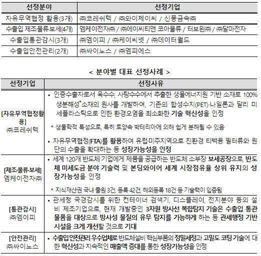 관세행정 분야에서 우수기업으로 확인된 ‘수출입 안전관리 우수업체(AEO)’나 ‘인증수출자’를 우선 고려하여, 최종 선정기업 12개사를 확정했다.
