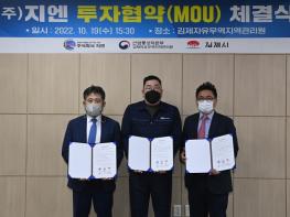 [중앙뉴스라인, 정영철기자] 김제시, 김제자유무역지역관리원이 지난 19일 김제자유무역지역 회의실에서 자동차부품 전문 제조업체인 ㈜지엔과 투자협약을 체결했다.