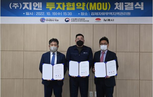 김제자유무역지역관리원에서 진행된 이번 협약식에는 정성주 김제시장, 유재열 산업통상자원부 김제자유무역지역관리원장과 이현석 ㈜지엔 대표가 참석했다.