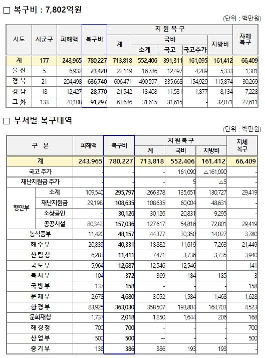 중대본은 복구비 지원규정에 따라 재산피해액과 복구비를 산정하여 지원하되, 사유시설 피해까지 유발한 공공시설은 유사한 피해가 재발되지 않도록 복구계획을 수립했다고 설명했다.