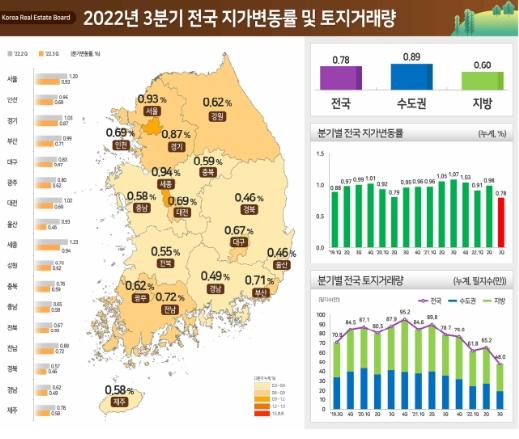 [중앙뉴스라인, 장성대기자] 국토교통부와 한국부동산원(원장 손태락)은 ‘22년 3분기 전국 지가는 0.78% 상승하여 ‘22년 2분기(0.98%) 대비 0.20%p,‘21년 3분기(1.07%)대비 0.29%p 감소했다고 밝혔다.