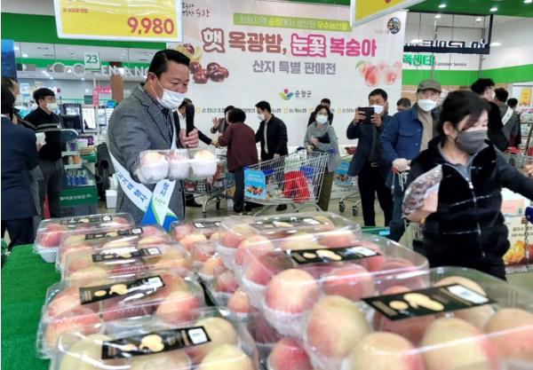 [중앙뉴스라인, 정영철기자] 순창군이 26일 서울 양재 하나로 유통센터에서 순창군과 순창군조합공동사업법인이 함께 순창 햇옥광밤과 가을 복숭아인 눈꽃 복숭아 판촉행사를 가졌다고 밝혔다.