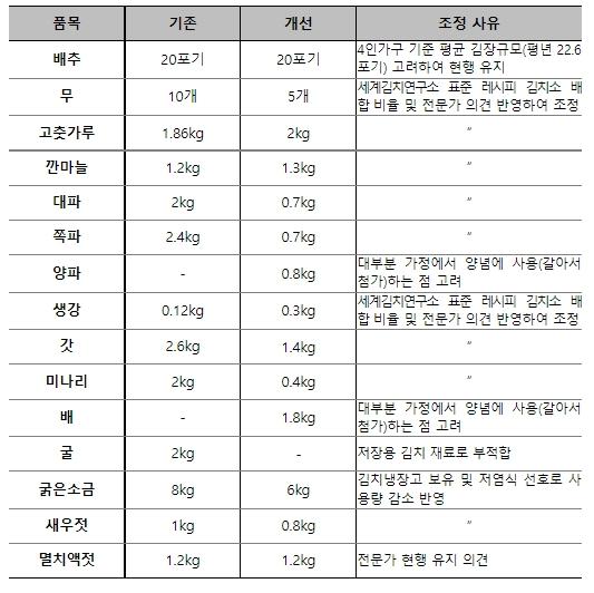 한국농수산식품유통공사에 따르면 주요 김장재료는 ‘배추, 무, 고춧가루, 마늘, 대파, 쪽파, 양파, 생강, 갓, 미나리, 배, 굵은 소금, 새우젓, 멸치액젓’의 14개 품목이다.