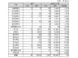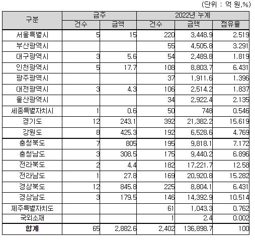지역별로는 경상북도 846억 원, 충청북도 805억 원, 강원도 425억 원, 그 밖의 지역이 807억 원이다.