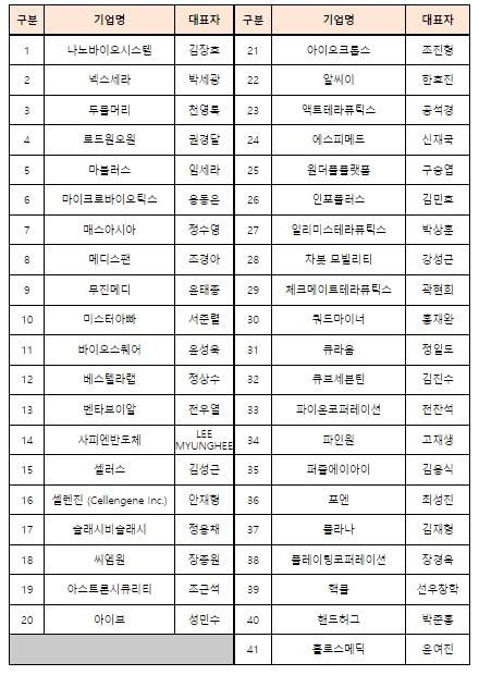 이번 선정기업 41개사의 평균 업력은 4.2년, 매출액은 30.3억원이고, 업종별로는 정보통신기술(ICT)기반 장(플랫폼) 18개사, 생명건강(바이오헬스) 분야 15개사 등으로 구성됐다.
