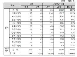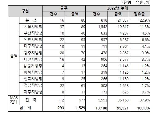 지역별 발주량을 보면, 총액계약 대상 552억 원 중 본청이 80억 원으로 14.5%를 집행하고 서울청 등 11개 지방청에서 472억 원을 각각 집행할 예정이다.