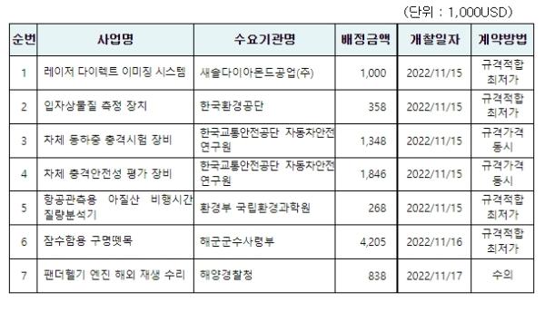 조달청, 외자 분야 주간 입찰동향 (2022.11.14. ~ 11.18.)