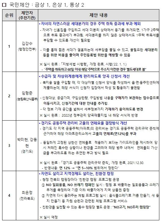 ‘경기도 공동주택 관리비 고율의 연체요율 결정방식 개선’을 제안한 박미현, 강동현 씨와 ‘친환경 캠핑’을 제안한 최은정 씨는 국민제안 동상을 받았다. ‘고물상을 활용한 자원순환가계 운영’을 제안한 충북 청주시의 김길남 지방행정주사보와 ‘생분해성 플라스틱 소재(PBAT)를 식품용기에 선제적 허용’을 제안한 식품의약안전처의 김준현 보건연구사, 김동규 보건연구관도공무원제안 동상을 수상했다.