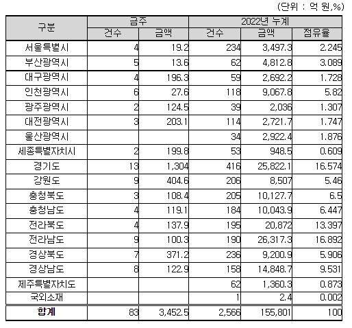 지역별로는 경기도 1,304억 원, 강원도 405억 원, 경상북도 371억 원, 그 밖의 지역이 1,373억 원이다.
