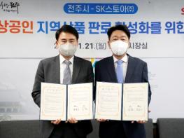 전주시와 SK스토아는 21일 전주시장실에서 우범기 전주시장과 윤석암 SK스토아 대표이사, 김형욱 한국T커머스협회장 등이 참석한 가운데 ‘소상공인 지역상품 판로 활성화를 위한 업무협약’을 체결했다.