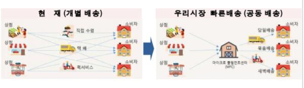 전통시장 내 유휴공간을 활용하여 마이크로 풀필먼트센터를 도입하고, 전용 플랫폼을 구축하여 배송 서비스를 제공하게 된다.