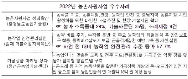 2023년 농촌자원사업은 가공·창업 및 판촉(마케팅) 지원을 통한 ‘소득화’와 유·무형 농촌자원 상품화 및 보존을 통한 ‘가치확산’, 농작업 안전 및 생활 향상을 통한 ‘활력 증진’ 3분야를 중점적으로 추진한다.