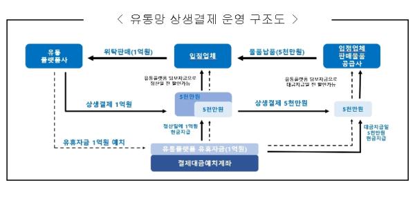 대기업의 신용을 제공하는 대신 유통거래터(플랫폼)기업의 유휴자금을 담보로 해서 입점업체에 위탁판매대금을 상생결제 방식으로 지급한다.